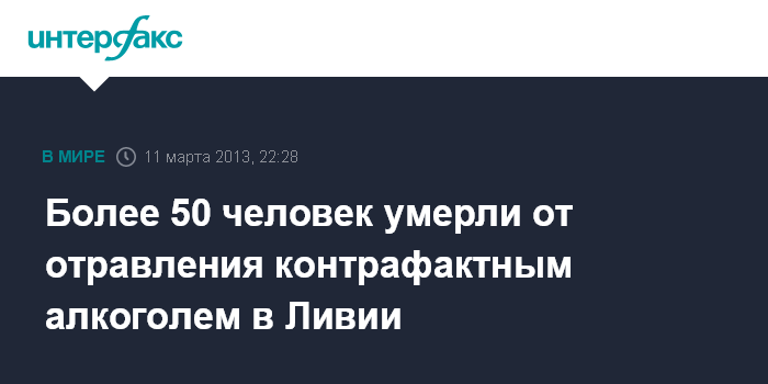 Каир. 11 марта. INTERFAX.RU - По меньшей мере, 51 человек скончался и еще более 300 были госпитализированы за последние три дня в результате отравления поддельным алкоголем в Ливии, сообщает в понедельник ливийское министерство здравоохранения.