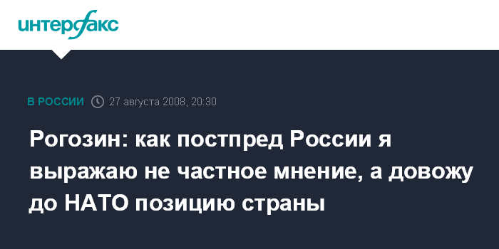 "Как постпред России я выражаю отнюдь не частное мнение, а довожу до сведения натовцев позицию нашей страны", - сказал Д.Рогозин "Интерфаксу" в среду.