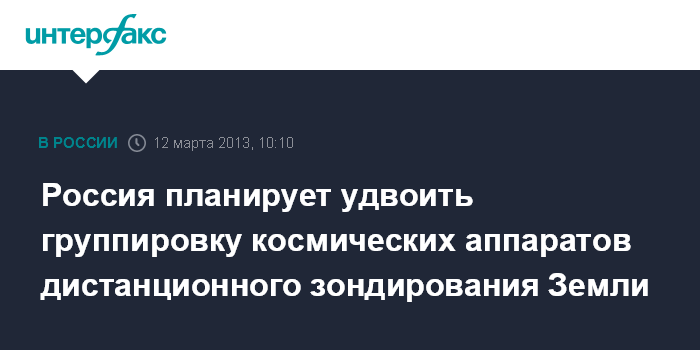 Москва. 12 марта. INTERFAX.RU - В 2013 г. Россия планирует запустить как минимум четыре космических аппарата дистанционного зондирования Земли (ДЗЗ), что позволит удвоить орбитальную группировку спутников этого типа, сообщил во вторник "Интерфаксу" источник в российской ракетно-космической отрасли.