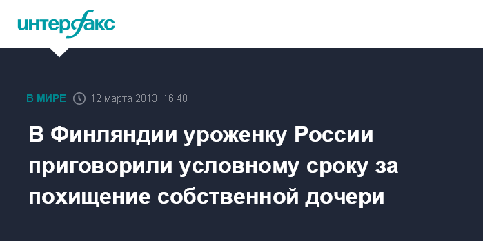 Хельсинки. 12 марта. INTERFAX.RU - Хельсинкский городской суд приговорил уроженку России Людмилу Риипинен к одному году и двум месяцам условно по обвинению в похищении собственной дочери.