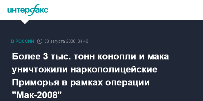 Владивосток. 28 августа. ИНТЕРФАКС-ДАЛЬНИЙ ВОСТОК - Итоги первого этапа антинаркотической операции "Мак-2008" подвели на прошедшем в Уссурийске выездном совещании представители наркоконтроля Приморья, милиции, УФСБ края, а также сотрудники таможни и представители 5-й армии Дальневосточного округа.