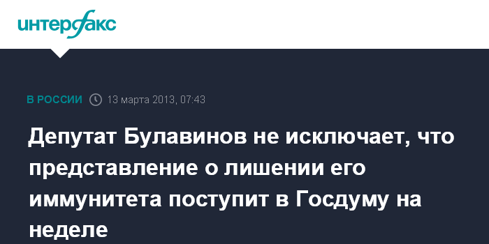 Москва. 13 марта. INTERFAX.RU - Депутат Госдумы от "Единой России" Вадим Булавинов полагает, что представление Генпрокуратуры о лишении его депутатской неприкосновенности будет внесено в нижнюю палату парламента до конца недели, пишет "Коммерсант" в среду.