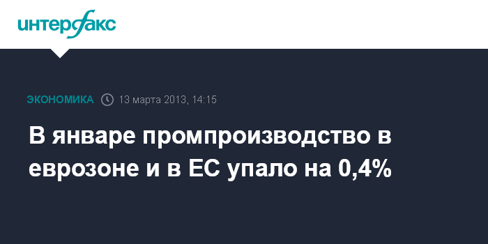 В 27 странах ЕС снижение промпроизводства в январе по отношению к декабрю также составило 0,4%. В годовом выражении промпроизводство упало на 1,7%.