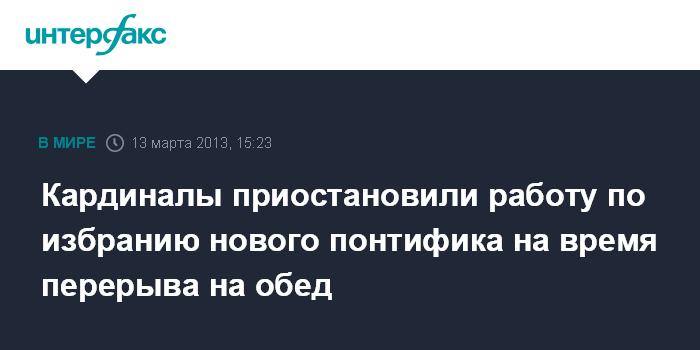 Рим. 13 марта. INTERFAX.RU - Кардиналы-выборщики, которым предстоит избрать нового папу римского, направились на обеденный перерыв, после чего проведут новое голосование, сообщают в среду итальянские СМИ.