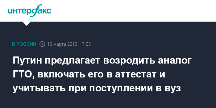 Москва. 13 марта. INTERFAX.RU - Президент России Владимир Путин предложил возродить комплекс ГТО в новом формате.