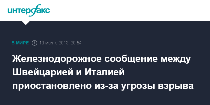Женева. 13 февраля. INTERFAX.RU - Железнодорожное сообщение между швейцарским городом Бригом (кантон Вале) и итальянским городом Изелле через Самплонский тоннель прервано в среду из-за угрозы взрыва, сообщил представитель железных дорог Швейцарии швейцарскому телеканалу RTS.