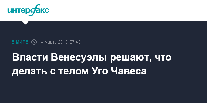 Лондон. 14 марта. INTERFAX.RU - Тело покойного президента Венесуэлы Уго Чавеса вряд ли будет подвергнуто долгосрочному бальзамированию, заявил исполняющий обязанности главы государства Николас Мадуро.