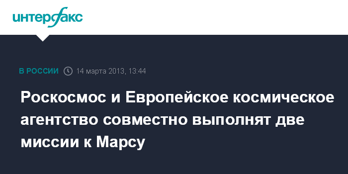 Москва. 14 марта. INTERFAX.RU - Российское и Европейское космические агентства в рамках совместного проекта "ЭкзоМарс" выполнят в 2016 и 2018 гг. две миссии к Марсу, при этом будут использоваться российские ракеты-носители "Протон".