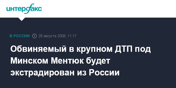 Москва. 28 августа. INTERFAX.RU - Задержанный в Москве белорусский гражданин Роман Ментюк, обвиняемый в совершении крупного ДТП под Минском в марте 2008 года, не стал обжаловать решение Генеральной прокуратуры России о выдаче его белорусской стороне и в ближайшее время будет экстрадирован на родину.