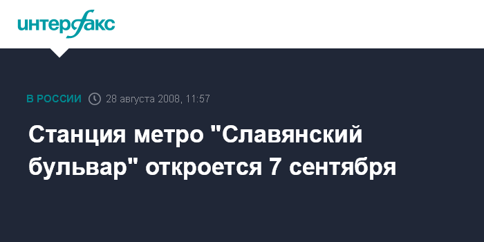 Москва. 28 августа. INTERFAX.RU - Столичный метрополитен откроет новую станцию - "Славянский бульвар" - во время празднования Дня города - 7 сентября, сообщил начальник московской подземки Дмитрий Гаев на пресс-конференции в четверг.