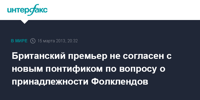 Брюссель. 15 марта. INTERFAX.RU - Премьер-министр Великобритании Дэвид Кэмерон заявил в пятницу о своем несогласии с давним утверждением нового папы римского Франциска о том, что Фолклендские острова принадлежат Аргентине.