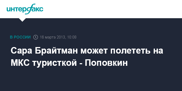 Королев (Московская область). 16 марта. INTERFAX.RU - Британская певица Сара Брайтман может полететь на Международную космическую станцию в качестве космического туриста, если в 2015 году Роскосмос изыщет для этого возможность, сообщил на пресс-конференции в Центре управления полетами глава космического агентства Владимир Поповкин. "В 2015 году у нас будет годовая экспедиция, но срок нахождения космического корабля "Союз" на орбите у нас ограничен, поэтому корабль для этого экипажа придется менять. Сегодня мы с нашими американскими коллегами ведем переговоры о том, как это сделать", - сказал В.Поповкин.