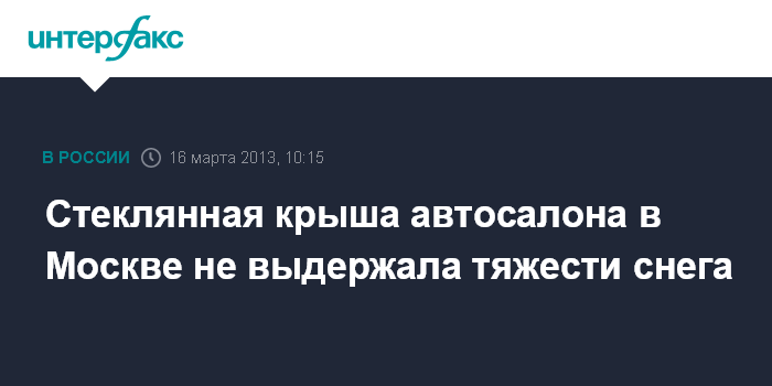Москва. 16 марта. INTERFAX.RU - В Москве под тяжестью снега обрушилась стеклянная крыша автосалона, говорится в сообщении, размещенном на сайте МЧС России. "Стеклянная крыша обрушилась на площади 100 кв.м. в здании салона, расположенном по адресу Острякова, дом 3, в 9:25 мск. В результате инцидента никто не пострадал", - отмечается в сообщении.