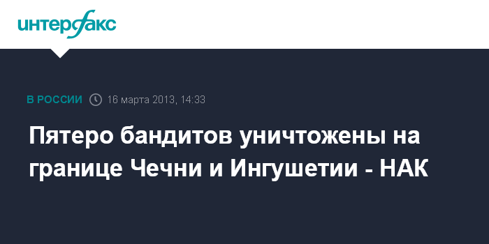 Москва. 16 марта. INTERFAX.RU - Информцентр Национального антитеррористического комитета сообщил о нейтрализации пятерых участников незаконного вооруженного формирования близ границы Чечни и Ингушетии.