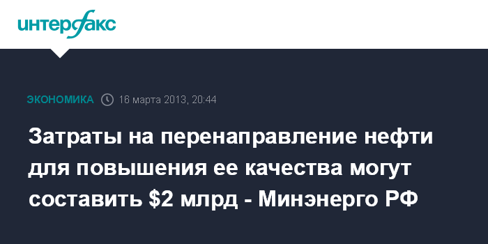 Москва. 16 марта. ИНТЕРФАКС-АНИ - Затраты на реализацию предложения "Транснефти" о корректировке грузопотоков российской нефти для улучшения ее качества в западном направлении могут достигнуть $2 млрд, сообщил журналистам глава Минэнерго Александр Новак.