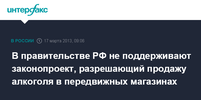 Москва. 17 марта. ИНТЕРФАКС - Правительство РФ не поддержало внесенный Законодательным собранием Ленинградской области в Госдуму законопроект, который разрешает розничную продажу алкогольной продукции посредством автомагазинов в населённых пунктах, не имеющих стационарных торговых объектов, сообщает сайт кабинета министров в воскресенье.