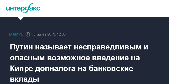 "В этом контексте, оценивая возможное решение о введении на Кипре дополнительного налога на банковские вклады, Путин сказал, что такое решение, в случае его принятия, будет несправедливым, непрофессиональным и опасным", - сказал Песков.