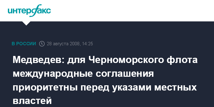 Москва. 28 августа. INTERFAX.RU - Президент РФ Дмитрий Медведев заявил о приоритетности международных соглашений перед решениями местных властей в вопросах, касающихся деятельности Черноморского флота РФ, базирующегося на Украине.