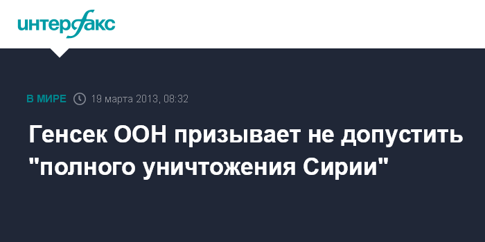 Нью-Йорк (ООН). 19 марта. INTERFAX.RU - Генеральный секретарь ООН Пан Ги Мун заявил, что правительства различных стран мира должны предпринять срочные действия, чтобы не допустить "полного уничтожения Сирии".
