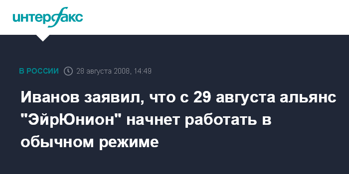 Москва. 28 августа. INTERFAX.RU - Вице-премьер РФ Сергей Иванов сообщил, что начиная с пятницы все самолеты авиационного альянса "ЭйрЮнион" перейдут в плановый режим работы.