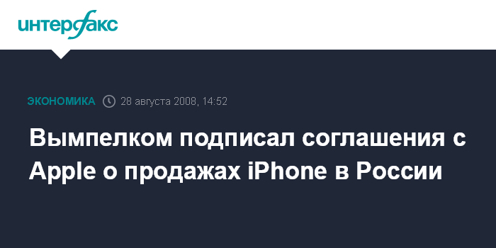 Москва. 28 августа. INTERFAX.RU - ОАО "Вымпелком" официально объявил о подписании соглашения с американской Apple Inc. о продажах телефонов iPhone в России.