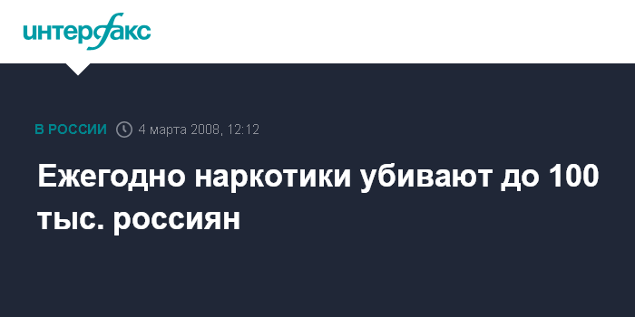 4 марта. INTERFAX.RU - До 100 тысяч человек ежегодно умирают в России из-за употребления наркотиков, сообщил замдиректора Федеральной службы РФ по наркоконтролю (ФСКН) Владимир Зубрин.