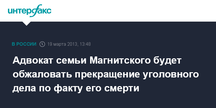 Москва. 19 марта. INTERFAX.RU - Родственники скончавшегося в СИЗО аудитора фонда Hermitage Capital Сергея Магнитского обжалуют решение о прекращении уголовного дела по факту его смерти.