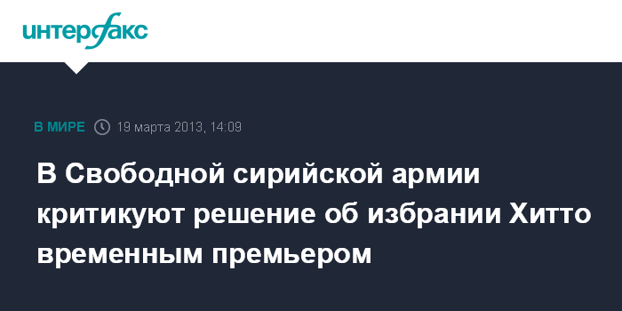 Каир. 19 марта. INTERFAX.RU - Представитель оппозиционной Свободной сирийской армии (ССА) подверг критике решение Национальной коалиции сирийских революционных и оппозиционных сил (НКСРОС) об избрании Хасана Хитто главой временного правительства, сообщает во вторник агентство EFE.