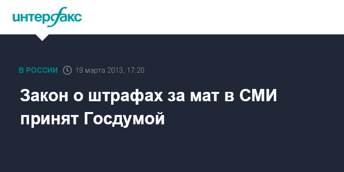Москва. 19 марта. INTERFAX.RU - Госдума во вторник приняла в третьем, окончательном чтении инициированный "единороссами" закон, которым устанавливаются штрафы за использование нецензурных выражений в средствах массовой информации.
