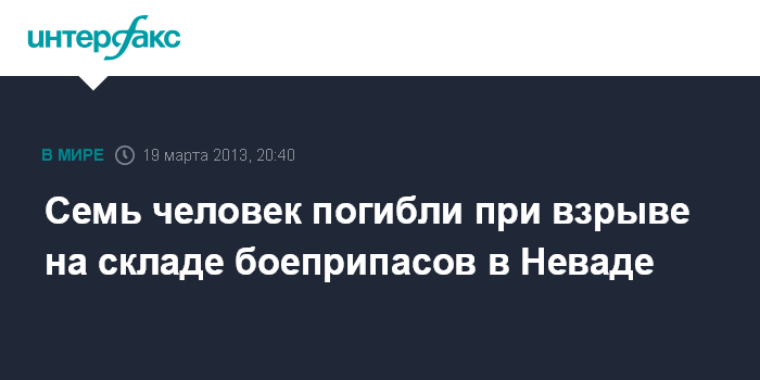 Вашингтон. 19 марта. INTERFAX.RU - Семь человек стали жертвами взрыва на складе боеприпасов у города Хоторн в американском штате Невада, сообщил во вторник американский канал NBC.