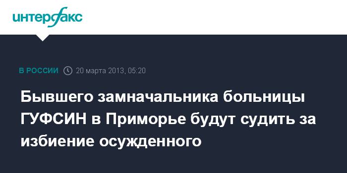 "По версии следствия, вечером 10 октября 2012 года обвиняемый вызвал в служебный кабинет осужденного и избил его", - сообщила в среду агентству "Интерфакс-Дальний Восток" старший помощник руководителя СУ СКР по Приморью Аврора Римская.