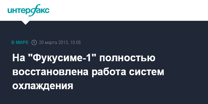 Токио. 20 марта. INTERFAX/RU - Неполадки в работе системы охлаждения хранилищ с отработанным топливом на японской АЭС "Фукусима-1" полностью устранены, сообщили в электроэнергетической компании TEPCO.