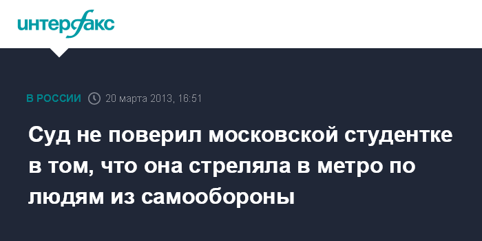 Москва. 20 марта. INTERFAX.RU - Тверской суд Москвы приговорил к трем годам заключения в колонии общего режима студентку Александру Лоткову, которая из травматического пистолета ранила двух молодых людей на станции "Цветной бульвар" в мае прошлого года.
