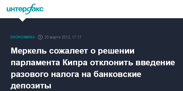 Накануне кипрский парламент проголосовал против введения беспрецедентного налога на банковские депозиты. Закон, предусматривавший введение одноразового налога в 6,75% на вклады ниже 100 тыс. евро и в 9,9% на вклады свыше 100 тыс. евро, являлся условием предоставления Кипру финансовой помощи от Еврогруппы в размере 10 млрд евро.