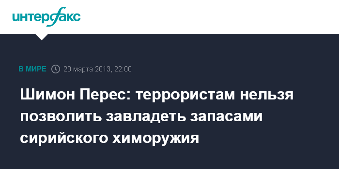 Иерусалим. 20 марта. INTERFAX.RU - Власти Израиля не допустят ситуацию, при которой находящееся на территории Сирии химическое оружие попадет в руки боевиков из террористических группировок, заявил в среду израильский президент Шимон Перес.