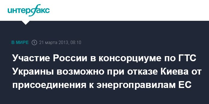 Как подчеркнул премьер, это предложение будет интересно для России в том случае, "если мы будем понимать, что наши интересы - "Газпрома" и государства в целом - там (в консорциуме) гарантированы". Гарантия, по словам Медведева, заключается в том, что "мы не попадем в ситуацию, когда нас при определенных событиях просто выставят из этого консорциума, или признают его несоответствующим тем или иным европейским правилам или условиям договора, который оформляет отношения (Украины - ИФ) с Энергетической хартией".