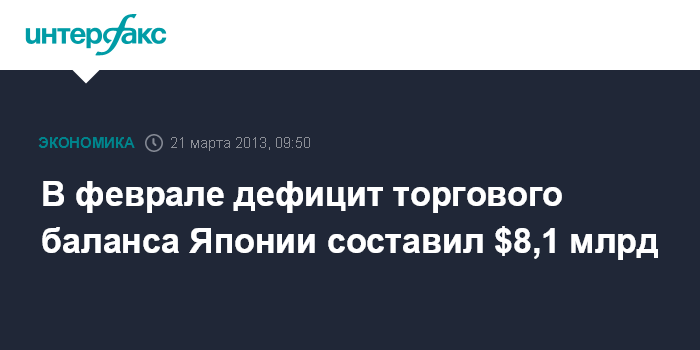 21 марта. FINMARKET.RU - В феврале Япония зафиксировала дефицит торгового баланса восьмой месяц подряд - это самый длительный с 1980 года период, в течение которого сальдо баланса внешней торговли страны остается отрицательным, сообщает агентство Bloomberg.
