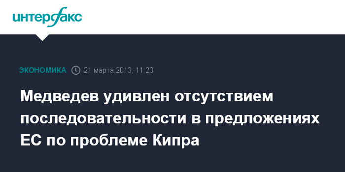 Москва. 21 марта. INTERFAX.RU - Премьер-министр РФ Дмитрий Медведев назвал непредсказуемой и непоследовательной предложенную ЕС схему урегулирования проблемы Кипра.