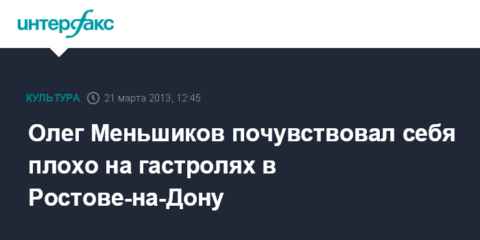 Ростов-на-Дону. 21 марта. INTERFAX.RU - В Ростове-на-Дону пришлось отменить спектакль с участием Олега Меньшикова из-за его плохого самочувствия, сообщили в четверг агентству "Интерфакс-Юг" в пресс-службе театра им. Ермоловой (Москва), чьим художественным руководителем является актер.