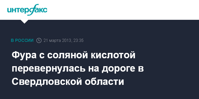 Москва. 21 марта. INTERFAX.RU - Фура с соляной кислотой опрокинулась в Свердловской области, пострадавших нет, сообщили "Интерфаксу" в ночь на пятницу в пресс-центре МВД России.