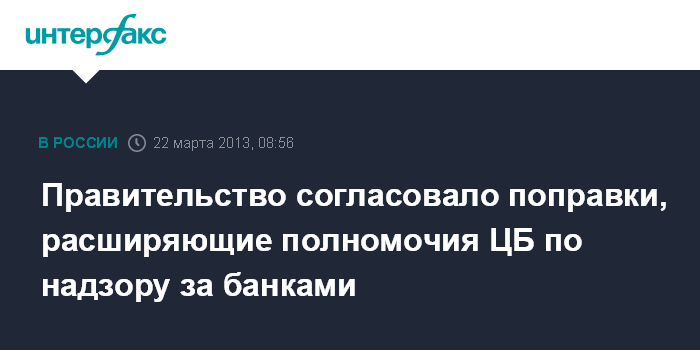 Москва. 22 марта. INTERFAX.RU - Правительство РФ согласовало изменения в законодательство, радикально расширяющие полномочия ЦБ по надзору за банками. Если поправки будут приняты, регулятор сможет вводить жесткие санкции в отношении акционеров кредитных организаций, получит право устанавливать повышенные нормативы для рискующих игроков и даже возможность контролировать вознаграждения менеджмента, пишет газета "Коммерсант".