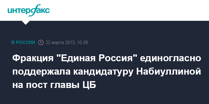 Москва. 22 марта. INTERFAX.RU - Фракция "Единая Россия" единогласно поддержала кандидатуру Эльвиры Набиуллиной на пост главы ЦБ РФ, сообщил глава фракции, заместитель председателя Госдумы Владимир Васильев по итогам встречи с ней в пятницу.
