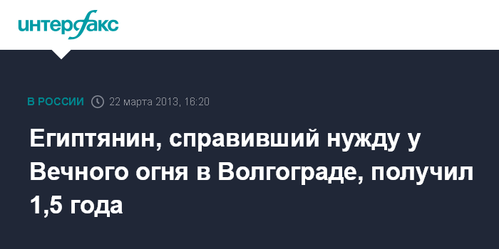 Волгоград. 22 марта. INTERFAX.RU - Суд Центрального района Волгограда в пятницу вынес обвинительный приговор гражданину Египта, справившего нужду в Вечный огонь в центре города.