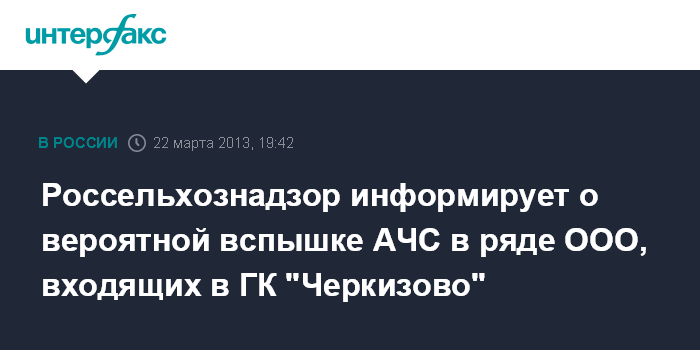 Москва. 22 марта. INTERFAX.RU- Россельхознадзор информирует о вероятной вспышке африканской чумы свиней на некоторых предприятиях, входящих в группу "Черкизово". В группе наличие опасной болезни отвергают.