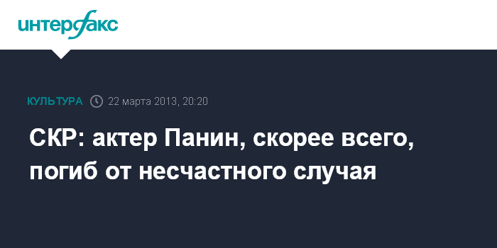 Москва. 22 марта. INTERFAX.RU - Версия о несчастном случае в деле о гибели актера Андрея Панина, скорее всего, подтвердится, сообщил официальный представитель Следственного комитета России Владимир Маркин.