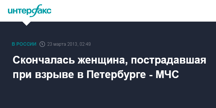 Санкт-Петербург. 23 марта. ИНТЕРФАКС СЕВЕРО-ЗАПАД - Женщина, пострадавшая в результате взрыва и последовавшего пожара в жилом доме в Петербурге в пятницу, скончалась в больнице, сообщили "Интерфаксу" в пресс-службе ГУ МЧС России по городу.