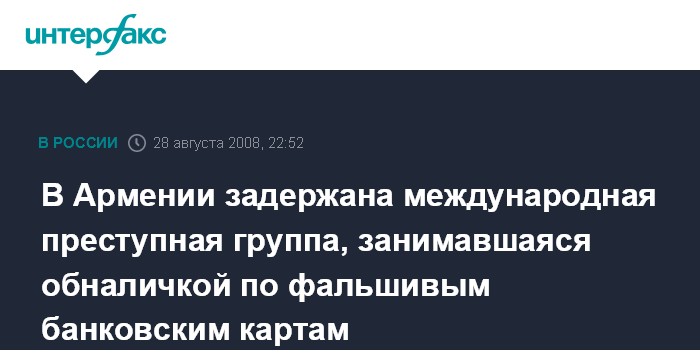 Ереван. 28 августа. ИНТЕРФАКС - Служба национальной безопасности Армении задержала международную преступную группу, в которой были вовлечены трое граждан Румынии и один гражданин Латвии, сообщили в четверг в пресс-центре СНБ.