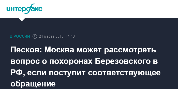 Песков: Москва может рассмотреть вопрос о похоронах Березовского в РФ, если поступит соответствующее обращение