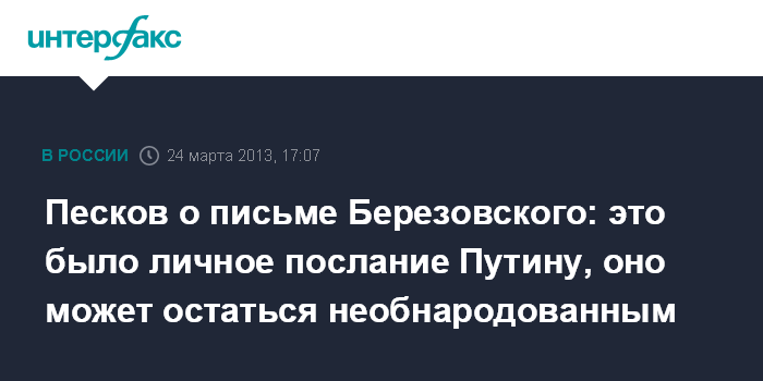 Москва. 24 марта. INTERFAX.RU - Пресс-секретарь президента РФ Дмитрий Песков сомневается в том, что письмо Бориса Березовского Владимиру Путину может стать достоянием общественности, но подтверждает факт его существования.