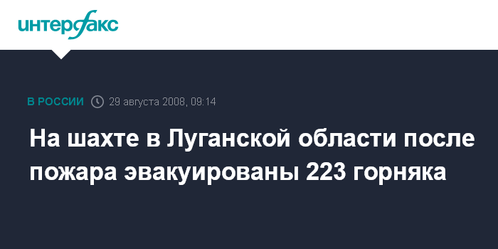 Москва. 29 августа. INTERFAX.RU - В городе Антрацит (Луганская область) из-за пожара на поверхности шахты "Комсомольская" в четверг были эвакуированы 223 горняка.